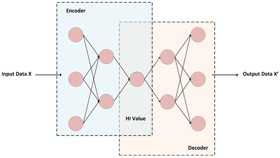 The SAE network is built using TensorFlow in the Keras framework with 3–2–1–2–3 structure, where 3 corresponds to the 3 normalized input features, 2 is the number of nodes at the first and third hidden layers, and 1 is the dimension of the feature obtained from the first hidden layer, which is the health indicator. The hyperparameters used by the SAE network are included in Table 1. A schematic diagram of the SAE model structure is shown in Figure 2. The three normalized and one-dimensional input features correspond to the normalized values of the amplitudes of bins 2X, 3X, and 4X BPFO gathered during the lifetime of the electric motor. The encoder fuses these input features into a low-dimensional feature, which is called HI value. The purpose of the decoder is to reconstruct the original input from the encoded representation (HI value) produced by the encoder. It takes the encoded representation as input and generates an output that should be as similar as possible to the original input data. This reconstruction process allows the SAE to learn a compact and informative representation of the input data, containing only the most important information.