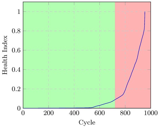 The HI curve is divided into two stages based on its trend. The first stage corresponds to the correct operation of the electric motor, where a stable trend can be seen. The second stage starts with the appearance of failures or anomalies in the operation of the equipment, where an increasing trend of the curve is seen. An example of how the HI curve is divided into healthy (green area) and damaged (red area) stages is shown in Figure 3.