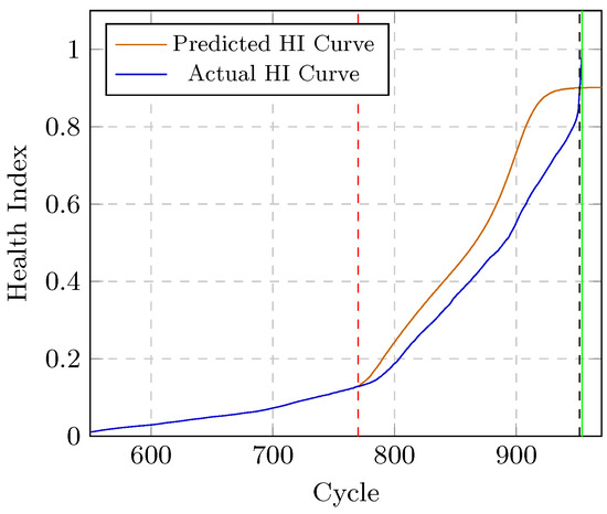The threshold separating the two areas is determined as the first point where the difference between the HI predicted in 75 cycles and the HI at that time is greater than 0.02. It is in the red area when the RUL should be predicted.