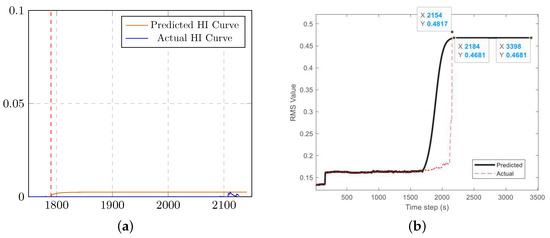 The model was tested with IMS dataset no. 1, which presents inner race rather than outer race failures. Figure 8 shows the RUL prediction results obtained by the proposed model (Figure 8a) and by the work presented by Saufi and Hassan [58] (Figure 8b, extracted from their paper). As seen in Figure 8a, the HI curve predicted by the proposed model stays near 0, meaning that there will be no outer race failure in the future. However, in the work presented by Saufi and Hassan [58], the RUL prediction shows that in cycle 2184 there will be an unspecified failure.