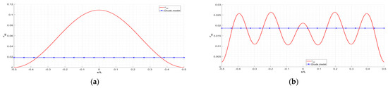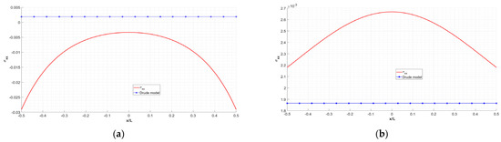 If the observation point (under the assumption of large L), is placed rather far from the edges, the arguments of Bessel functions become large, so that the asymptotic relations [52]. In this case, the last two terms in (25) become indefinitely small. The first term, which is exactly equal to the Drude conductivity , becomes dominate over the whole area of the ribbon excluding the narrow vicinities of the edges. Thus, it is demonstrated that in this limit our model asymptotically reduces to the classical expression for the Drude conductivity.