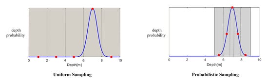 In Equation (4), is the probit function, and is the probability mass covered by the interval . Note that the value of depends only on and , independent of the pixel points themselves. Figure 2 demonstrates uniform sampling versus probability sampling. We can improve accuracy while evaluating fewer candidates because we only sample deep candidates within the -sigma confidence interval.
