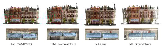 Geometry-Based Multi-View Stereo. Multi-view stereo (MVS) is a process of generating dense correspondences from multiple images of known camera poses to produce dense 3D point cloud reconstruction results. According to the output result representation, traditional MVS methods are classified into three categories: voxel-based reconstruction [,], point-cloud-based reconstruction [,], and depth-map-based reconstruction [,,]. In contrast, the depth-map-based methods are more efficient. This class of methods is generally based on the iterative optimization of PatchMatch [,,] to estimate the depth map. Galliani et al. [] propose Gipuma, which adopts a red–black checkerboard grid propagation approach that makes full use of GPUs to achieve massively parallel operations and greatly improves the efficiency of the algorithm. Schönberger et al. [] propose COLMAP, which utilizes a more complex view selection strategy based on the Markov chain model. ACMM [] proposes a multiscale geometric consistency bootstrap framework that can be used at different scales to sense remarkable information and to convey information through the geometric consistency of multiple views. Although these methods have achieved relatively good results, they still fail to match for untextured areas or non-Lambertian surfaces.