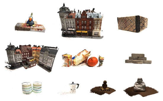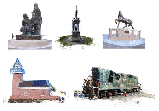 - Moulon, P.; Monasse, P.; Perrot, R.; Marlet, R. Openmvg: Open multiple view geometry. In Proceedings of the International Workshop on Reproducible Research in Pattern Recognition, Cancún, Mexico, 4 December 2016; pp. 60–74. [Google Scholar]