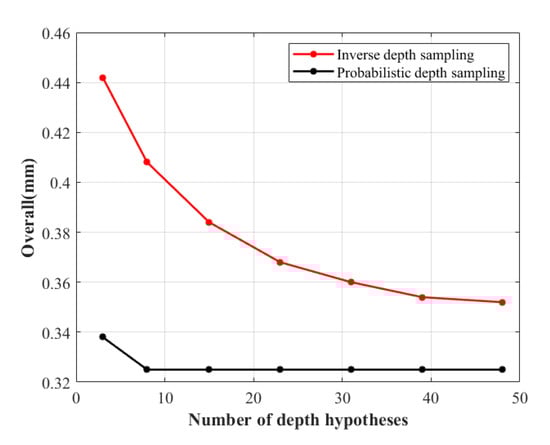 Coarse-to-Fine Depth Sampling. Most learning-based MVS methods [,,,,] use the same depth hypothesis candidate set for all pixels, and to obtain higher accuracy, the depth candidates should be densely sampled, but this leads to huge memory consumption and long computation time. Recent MVS approaches [,,] use a coarse-to-fine strategy to construct multi-scale cost volumes to get around this constraint, abandoning the previous construction of cost volumes at a fixed resolution, which results in lower computation time and GPU memory consumption. Ref. [] obtains the depth ranges of different resolution layers and their intervals according to a fixed formula. Ref. [] obtains the depth hypotheses of different resolution layers by acquiring the points of neighboring pixel projections of the source image. Ref. [] introduces an adaptive resolution cost-volume-based depth estimation method, where the depth hypotheses space of each layer is obtained from the uncertainty of the pixel projections of the previous layer. We introduce probabilistic depth sampling where the depth candidates for each pixel are sampled from the single-view depth probability distribution of each pixel, which allows for higher accuracy while evaluating fewer depth candidates.