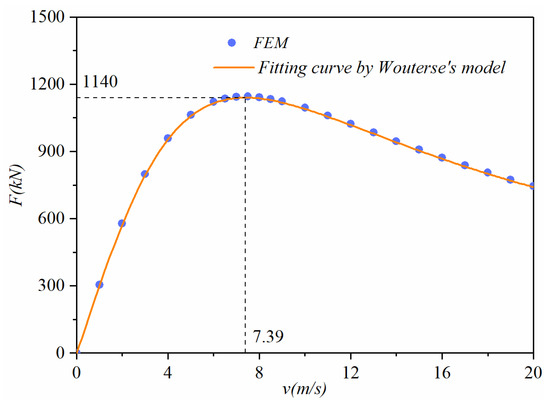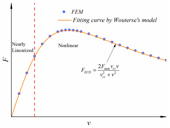 where is the peak damping force for the ECD, and is the critical relative velocity when the peak damping force is reached. It is noticeable that these two mechanical model parameters are determined by the physical design parameters of the TLECD-HA. Figure 2 depicts the force-velocity relationship obtained from simulations using the finite element method (FEM) and the fitting curve acquired using Wouterse’s semi-empirical model. It can be noted that Wouterse’s model is still applicable to the TLECD-HA. In the following modeling and response analysis, the focus is on the mechanical characteristic of the TLECD instead of its physical configuration, and therefore, the TLECD is simply referred to as the ECD.