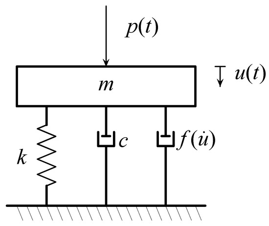 Structural vibration control methods and devices have been well-developed to suppress vibration [1,2,3]. Unlike force loadings with a relatively long duration, impulse loadings are a special form of loading that can be applied to a structure in a very short period. In general, when the ratio of the duration of loading to the natural period , the loading can be defined as an impulse [4,5]. In reality, impulsive loadings can be generated from many sources, including free-fall impacts, collisions, explosions, short-duration pulse-type seismic excitations, aircraft landing, braking loads, and many more. Although the duration of impulse loadings is relatively short, the peak forces exerted on the structure are usually quite high. As a result, the loadings can generate high responses and damage the structure consequently. This means that the design of the structure or the corresponding measures to prevent shock is crucial. In order to alleviate high responses caused by shock pulses, a wide range of control devices have been proposed and analyzed. Based on the stability maximization criterion [6], various types of dynamic vibration absorbers have been designed to decay transient responses [7,8,9]. Moreover, some nonlinear devices [10] and semi-active [11] or active control systems [12,13] were also proposed for shock vibration control. Compared to the complicated vibration control system, it is simpler and more direct to exert resistance forces on the structure by dampers to reduce structural transient responses caused by impulsive loadings. Hence, it is necessary to calculate and analyze structural transient responses under shock excitation. Responses of the structure without dampers or with just linear dampers can be easily calculated when subjected to simple loading forms, such as sinusoidal loading and rectangular loading [5,14]. Moreover, the responses of the structure with nonlinear fluid viscous dampers (FVDs) under impulsive loadings have been analyzed [15,16].