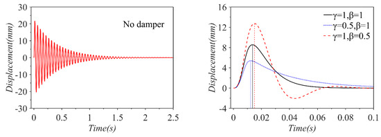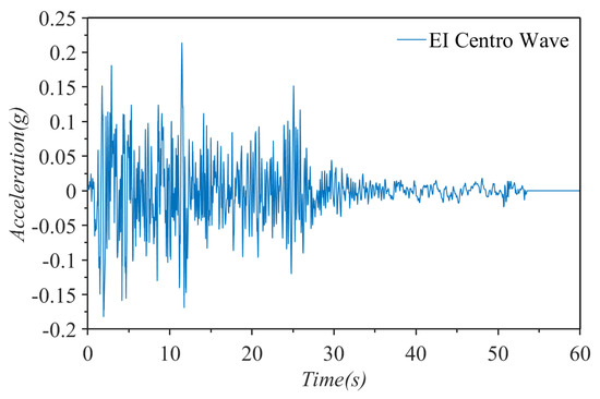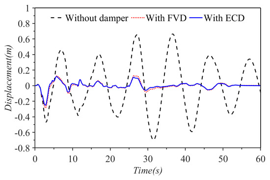 Moreover, the shock vibration control performance of the ECD and the FVD under seismic excitation is also considered in this study. Figure 9 shows the acceleration time histories of the EW El Centro wave, and Figure 10 shows the displacement time histories of the SDOF system in three conditions, i.e., without damper, with an FVD, and with an ECD. In this case, the damper constant and the damper exponent of the FVD are 12 kN·s/m and 0.7, respectively. The parameters of the ECD are determined by the design method in [38], with and , where is the maximum velocity of this SDOF system with a FVD under seismic excitation. Considering that the power spectral densities of the ground motions are larger between 1–2 Hz, the natural period of the structure is adjusted to 10 s to meet the definition of impulsive loading. Other structural parameters are set to be the same as those in Section 4.1. As can be seen from Figure 10, the ECD can effectively reduce structural displacement, and it is better than the FVD in terms of displacement attenuation.