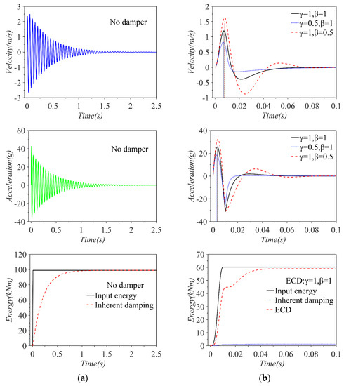 Under a half-cycle sine shock, the time-history responses for displacement, velocity, acceleration, and energy of the SDOF system without a damper and with ECDs are shown in Figure 5. The parameters of the half-cycle sine shock are shown in Table 2. From these time histories, it can be observed that there is a dramatic reduction in the peak responses, including the maximum displacement, maximum velocity, maximum acceleration, and the time for decaying to stabilization of the SDOF system when equipped with an ECD. The peak responses and the time to reach the peak responses are also observed to decrease when the dimensionless critical relative velocity decreases or the peak dimensionless damping force increases.