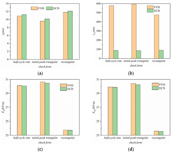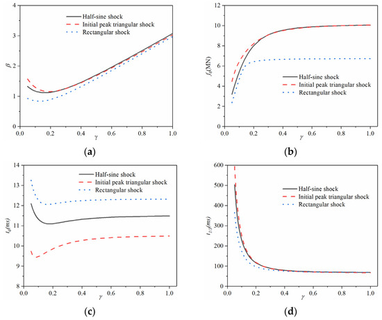 It is also observed that the differences between the half-cycle sine shock and the initial peak triangular shock in Figure 6a,b,d are quite small for dimensionless critical relative velocity from 0.2 to 1. This means that when the dimensionless critical relative velocity of the ECD is between 0.2 and 1, the dynamic properties of the system with the ECD subjected to these two forms of shock loading are comparable.