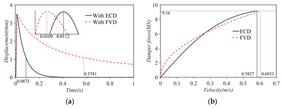 Figure 7 shows the comparison of the two time indexes and two energy indexes when the system is equipped with the FVD and the ECD, respectively. It can be observed from Figure 7a,b that at the same maximum displacement and damper force, the SDOF system with the ECD requires a slightly longer time to reach the target maximum but much less time to decay to one-third of the target maximum displacement. This means that the ECD is more advantageous in some design cases where the structure requires to return to the initial state. From an energy perspective, Figure 7c,d illustrates that compared to the FVD, the ECD slightly reduces the energy input of the system and also dissipates less energy. This is particularly true when the system is subjected to an initial peak triangular shock. The displacement time history of the SDOF systems with an ECD and an FVD subjected to half-cycle sine shock is shown in Figure 8a, and the differences in the two time indexes between the ECD and the FVD can be clearly seen. From Figure 8b, it can be observed that when the velocity is less than 0.27 m/s, the ECD provides the lower damper force, although it provides the higher damping force when the velocity is higher than 0.27 m/s.