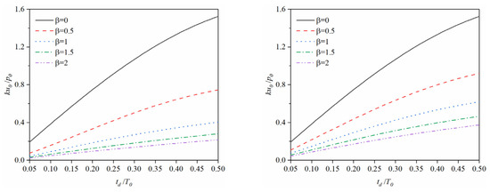 Figure 6 shows the required dimensionless damping force of the ECD and responses of the SDOF system with an ECD with a varying dimensionless critical relative velocity subjected to half-cycle sine, initial peak triangular, and the rectangular shock when reaching the target maximum displacement. From Figure 6a, it can be seen that there is a minimal dimensionless maximum damping force for all shock loadings, and the system with the ECD subjected to rectangular shock always requires the minimum value. In general, the larger maximum damping force of the ECD represents a larger dimension and a higher cost, and therefore, the optimal value of the dimensionless maximum damping force is significant. Similarly, a minimal time of the target maximum displacement can also be noted in Figure 6c, and the values are always the largest and the smallest for rectangular and initial peak triangular shock, respectively. This implies that the ECD can be designed for optimal control when reaching the target maximum displacement.