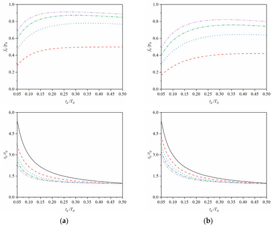 Figure 11 shows the SRSs of the SDOF system under half-cycle sine shock, and represents the changes in peak responses with the ratio of duration to the natural period of the system for various mechanical parameters of the ECD. The SRSs of the structure subjected to other forms of shock impulse can be obtained by the same method, and therefore, not all of them are listed here. The maximum elastic force can be calculated by the known maximum displacement and the stiffness of the system k. Based on the SRS, the peak responses of a certain system with certain design parameters of the ECD can be predicted, or the parameters of the system and the ECD can be designed for target peak responses. Because of the dimensionless characteristic, the SRS is applicable to a wide range of systems.