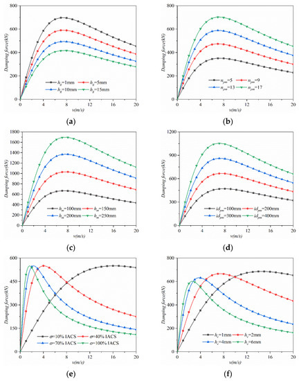 Influence of physical design parameters of the ECD on its constitutive behavior: (a) Damping force versus the radial height of air gap; (b) Damping force versus the number of PM rings; (c) Damping force versus the radial height of PM rings; (d) Damping force versus the radial inner diameter of PM rings; (e) Damping force versus the conductivity of conductor; and (f) Damping force versus the radial height of conductor.