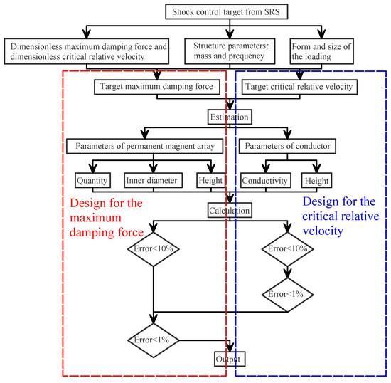 Based on the flowchart in Figure 13, a design example is given. The parameters of the structure and the loading are taken to be the same as the structural traits in Section 4.1 and the half-cycle sine shock in Section 4.3, respectively. The dimensionless maximum damping force is considered to be 0.1, and the dimensionless critical relative velocity is set to 2.0. As a result, according to Equations (1) and (2), the target maximum damping force is 1.15 MN, and the target critical relative velocity is 7.35 m/s. After proceeding with the design flow chart in Figure 13, the actual maximum damping force and the actual critical relative velocity are obtained as 1.14 MN and 7.39 m/s, respectively. Some corresponding physical design parameters of the TLECD-HA are shown in Table 3.