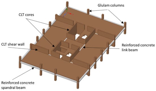 Lateral load resisting system: Wind load acting on the building transfers through the floor diaphragm and is opposed by coupled action of core walls and CLT shear walls. The concrete link connects the CLT shear wall and core wall beams so that the entire building acts as a shear flexure cantilever [33]. Shear walls are positioned around the center of the building, forming a sizeable tube-like structure to resist the uplift from the wind loads from both directions. The extra shear wall extends from the core to the perimeter column in both directions (see Figure 2 for details) [27,31]. The Holz–Stahl–Komposit (HSK) system links the CLT floors and walls with spandrel beams [34]. Capacity design principles have been used for the lateral load-resisting system. Under seismic or extreme wind loads, three stages of progressive failure will happen: first, the inelastic rotation will occur on the reinforced concrete link beam; next, the HSK connector will yield; finally, wood crushing could occur at the corner of the CLT walls.