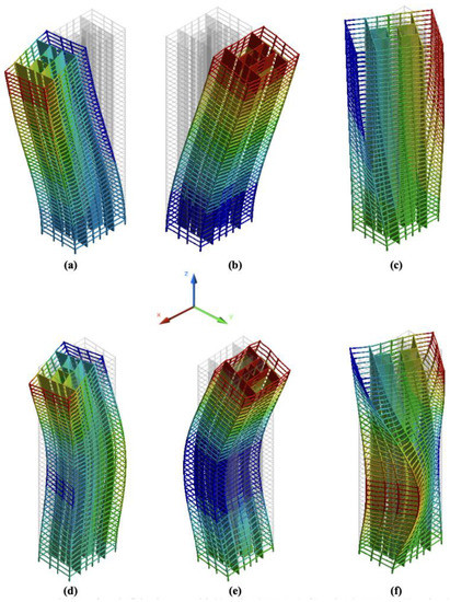 Figure 3 shows the mode shapes of the building for the first six modes. This building behaves like a combination of shear action and bending action. Although natural frequencies and mode shapes of the buildings are obtained through FEM, there is no convincing way to calculate the amount of inherent damping in the building because it depends on several parameters, such as friction between joints and hysteretic characteristics of the material. However, there have been some efforts to predict structural damping based on previous full-scale observations. For example, Tamura and Yoshida proposed one of the widely accepted formulas to predict the structural damping of tall buildings for the first mode [36], where building height and roof displacement are considered parameters. As a result, the inherent damping ratio of the tall building is given as follows: