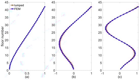 Mode shape comparison between FEM and lumped mass model in x-direction: (a) first mode, (b) second mode, and (c) third mode.