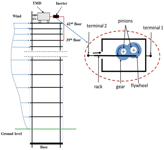Tuned mass damper (TMD) has been studied extensively in the past few decades, and those devices have been installed in many tall buildings around the world to reduce the vibration under wind load. However, the seismic performance of TMD in a tall building is poor and could worsen the structural responses if the excitation frequency is far from the tuning frequency [14,15]. Recently, modified versions of TMD have been studied extensively to find an optimal solution for multiple hazard loads (wind and earthquake). One modified version is a tuned mass damper inerter (TMDI), formed by introducing an inerter in classical TMD. Previous research has shown that the inerter could virtually increase the mass of TMD to reduce the structural response.