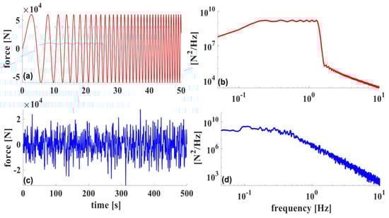 Excitation forces: (a) time history of a variable frequency sine wave, (b) spectrum of the VF sine wave, (c) time history of filtered white noise, and (d) the corresponding spectrum of the filtered white noise excitation.