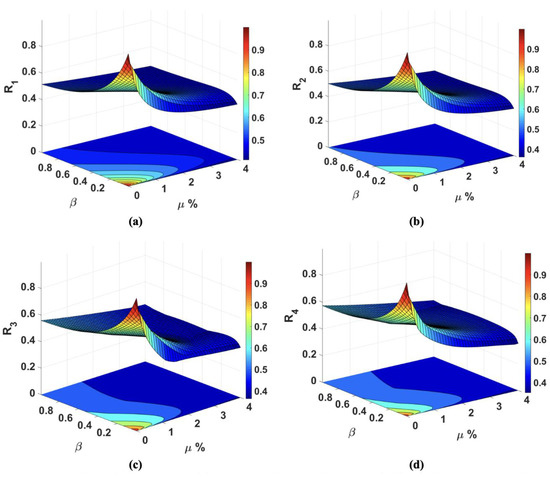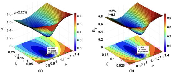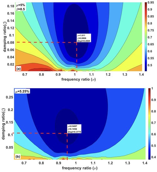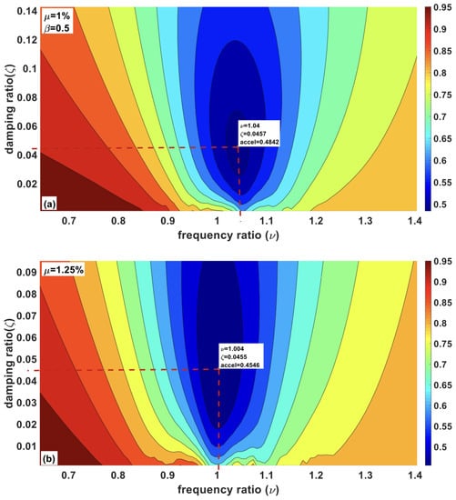 Similarly, the first line along the axis is the pure tuned inerter damper (TID) with no mass attached at the top. Except for the first two lines along each axis, the device acts as TMDI. As discussed in the previous sections, for the sizeable inertance value, the physical mass of the device could be significantly high. For a given mass ratio, a small inertance ratio reduces the device’s performance because it damages the optimum frequency and damping ratio, resulting in less energy dissipation. It is observed in Figure 9a,b that there is no significant reduction in the responses when the increases beyond 0.6.