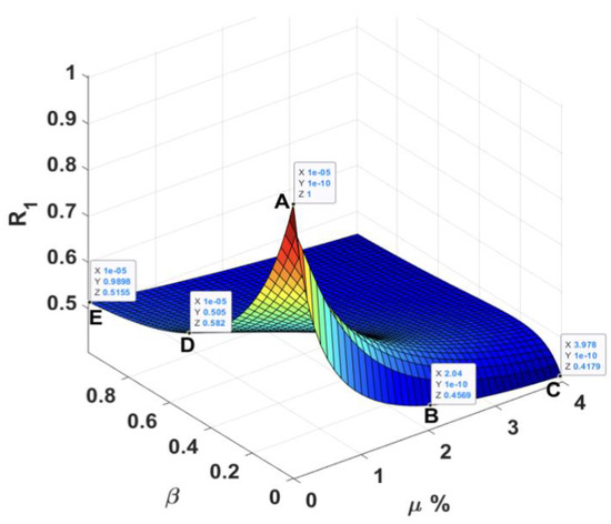 As defined by Equation (9), and represent the performance of TMDI for the reduction of root mean square (RMS) displacement and acceleration at the top floor, whereas and represent the performance for the reduction of peak displacement and peak acceleration at the top floor. Figure 9 shows the three-dimensional (3D) plot of normalized structural responses with respect to mass and inertance ratios. The normalized 3D plot of standard deviation (STD) and peak responses are then projected into the - plane, as shown in Figure 9.