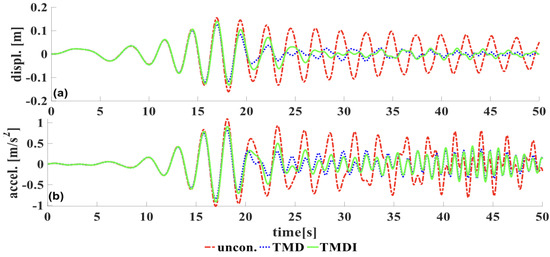 Figure 11a shows the optimization of TMD parameters, and Figure 11b shows the optimization of TMDI parameters under variable frequency sinusoidal excitation. The optimum parameters of both devices for various mass ratios are listed in Table 3. Figure 11 shows both devices’ most favorable frequency and damping ratios. It is observed that those parameters are different for each device to minimize the acceleration of the building. Similar to white noise excitations, under VF excitations for a 2% mass ratio, the optimal frequency ratio for TMD is smaller than 1(0.988). It is greater than 1(1.019) for TMDI. However, the optimal damping ratio is slightly higher in the case of TMD compared to TMDI. The performance of both devices increases as the mass ratio increases, as listed in Table 3. In both devices, the optimal frequency and damping ratio decrease as the mass ratio increases. Figure 12 shows the time history of displacement and acceleration of the top floor under VF excitations, and Figure 13 shows their corresponding response spectra. Optimized equivalent TMD reduced the STD displacement by 50%, whereas optimized TMDI reduced the same responses by only 43%. Similarly, peak displacement at the top floor is reduced by 17.9% using TMD, but TMDI reduces the peak displacement by 9.8%. This finding shows that optimized equivalent TMD has better control performance than TMDI when the physical mass of the inerter is considered.