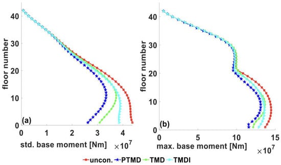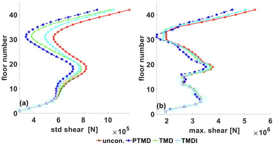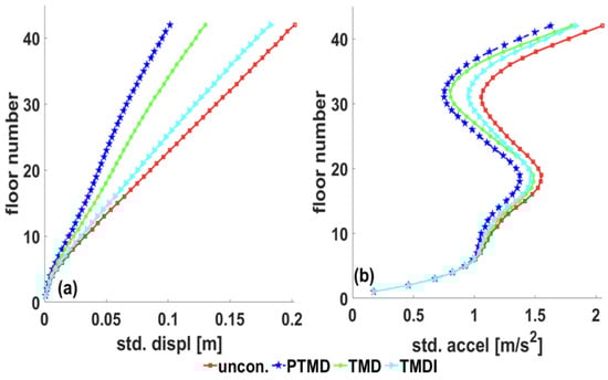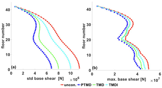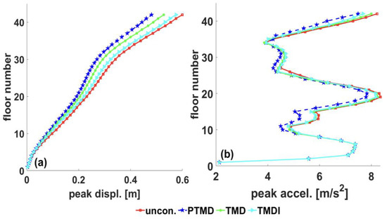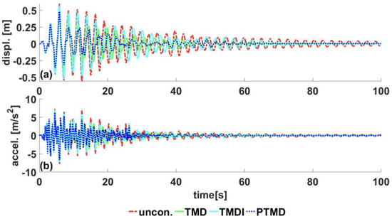 where is the mass of equivalent TMD, is the attached mass, is the inertance of the inerter in kg, and is the first modal mass of the building. It has been reported that the optimal performance of TMDI is observed when the inertance ratio ranges between 0.3 to 0.6, in consideration of practical applications [71,72]. This paper considers an inertance ratio of 0.5 to compare the performance with an equivalent linear tuned mass damper (TMD). Both equivalent TMD and TMDI are optimized under filtered white noise excitations for one-to-one comparison.