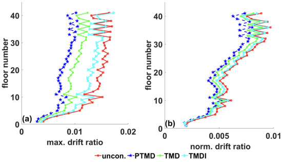 Similarly, the optimal damping ratio for TMDI is 8.06%, and the optimal damping ratio for TMD is 10.56%. When the mass ratio increases, optimal parameters for TMD and TMDI move far from each other, which can be well described by comparing Figure 7 and Figure 8. In many previous studies, optimal properties for TMDI are used for TMD without considering the physical mass of the inerter device. This shortage undermines the capability of linear TMD in two ways: the mass ratio of equivalent TMD becomes small, which results in reduced performance; conversely, by connecting the inerter with TMD, the optimum damping ratio and frequency ratio of the TMD are lost, which leads to lower performance. For example, TMDI with a 5% mass ratio reduces top floor acceleration by 58.8% and displacement by 54.35%, while the same responses are reduced by 65.78% and 62.25% using equivalent TMD.