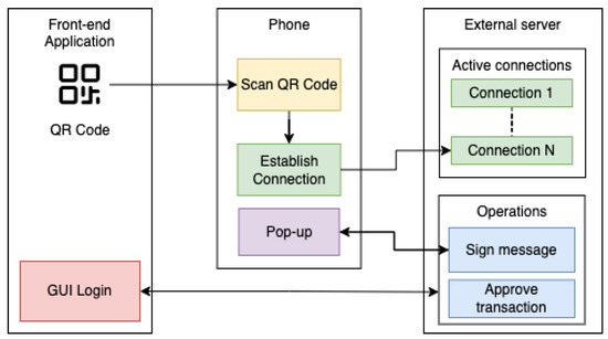 An example of interaction with mobile phone wallets can be seen in Figure 2. The GUI (graphical user interface) displays a QR code which, upon scanning, triggers a connection request. After the connection is successful, it is stored on a third-party server which facilitates communication between the dApp and the wallet, similar to browser extension wallets.
