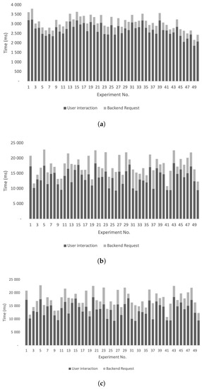 Using a publicly available platform that has implemented a login mechanism using SMS codes, a similar number of tests have been run, and the average time spent in the operation is 13.799 s (Figure 6c). The network load for this experiment is significantly higher (3.782 s) due to the architecture choice of the observed platform. User interaction times are higher due to operations that need to be carried out (insert phone number, wait for SMS, insert SMS code, and wait for validation). An increase of 511%, respectively 189% compared to the standard wallet login time and mobile wallet login time was observed.