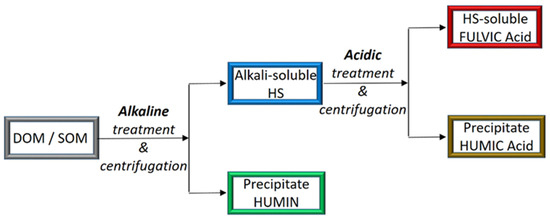 The chemical properties of HS are basically ascertained after extraction and fractionation of DOM or SOM according to the different solubilities. The soil sample, initially dispersed in concentrated alkaline solution, is first separated from the insoluble material (called humin) and then acidified with the addition of concentrated hydrochloric acid. The obtained precipitate is called humic acid (HA), while the remaining soluble fraction is called fulvic acid (FA) (see Figure 1).