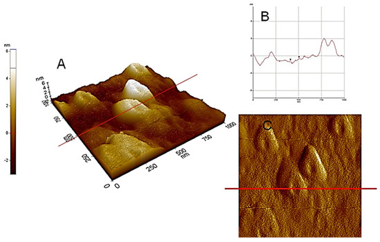 AFM−C (contact mode): (A) microtopography with 3D images of HA dispersed in pure water at pH 5, adsorbed and dried on a mica surface with section analysis (B) and amplitude (C).