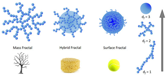 The application of fractal geometry allows for the determination of the mass distribution of the material within (mass fractals) or on the surface of the particles (surface fractals) [165]. Mass fractals are defined as those molecular agglomerates having a reticular structure, likewise trees where the branches are dendritic networks made up of smaller networks. In contrast, surface fractals have dense internal structure in which the fractal aspect is evident only at the particle surface. Depending on the type of investigation technique employed, the network would assume a collapsed spherical shape while on closer inspection it could result that it is irregular and not space filling. Between mass and surface fractals, partially penetrable hybrid structures may be found, likewise a porous sponge (see Figure 6). For an aggregate or cluster of N particles with radius (Rp), the fractal dimension df is defined as the exponent of the power law [166] , which roughly reflects the shape of the aggregate itself (Figure 6).
