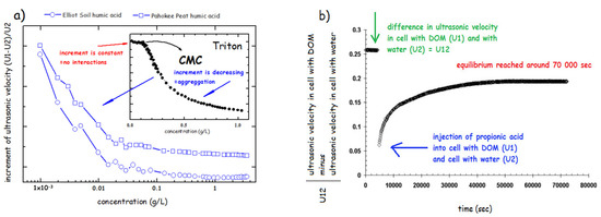 Differently from orthodox micellar solutions, humic pseudo-micelles were initially considered as a type of aggregates characterized by a broad distribution of both size and functional groups. According to that vision, pseudo-micelles still retain the ability of traditional micelles to sequester hydrophobic species that partition into the nonpolar microdomains [44,45,46]. Using ultrasonic velocimetry Kučerík et al. [47] demonstrated that the aggregation can be observed at concentrations as low as 1 mg∙L−1 under various pH and ionic strength conditions. The micelle-like behavior of HS was also investigated by Piccolo et al. [48] who verified through size exclusion chromatography (SEC), the effect of the concentration of organic acids on the HS dissociation into small-sized micellar aggregates. HS aggregation was also studied in aqueous solution by HPSEC [49].