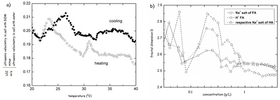DLS and zeta potential measurements have been extensively performed on aqueous solutions of HA and FA by Klučáková et al. [151,152,153,154,155]. Two main processes were found responsible for the dynamics of HA and FA in solutions: the dissociation of acidic functional groups and the dissociation of humic particles into smaller molecular associations and/or single molecules. In particular, fulvic particles in water were bigger than in alkaline solution as a result of suppressed dissociation. The decrease in particle sizes with increasing concentration was interpreted in terms of enhanced strength of intermolecular interactions favoring HA and FA particles to adopt a more collapsed or coiled configuration. From the measurement of zeta potential, it was found that the colloidal stability was higher for HA than FA, probably due to the lower dissociation degree of the functional groups in FA compared to HA. In another study, DLS technique was used on soil extracted HA to evaluate the effect of H+ on the aggregation kinetics in Na+, K+, Mg2+, and Ca2+ nitrate electrolyte solutions with different ionic concentrations [156,157].