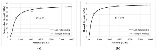 The strength chosen in Step 4 must be converted to maturity. Equations (2) and (3) can be rearranged to find the maturity relative to the chosen flexural or compressive strength, respectively. Using Equation (9), the maturity for the dataset at 20.7 MPa (3000 psi) can be calculated to be 800 °C-hr.