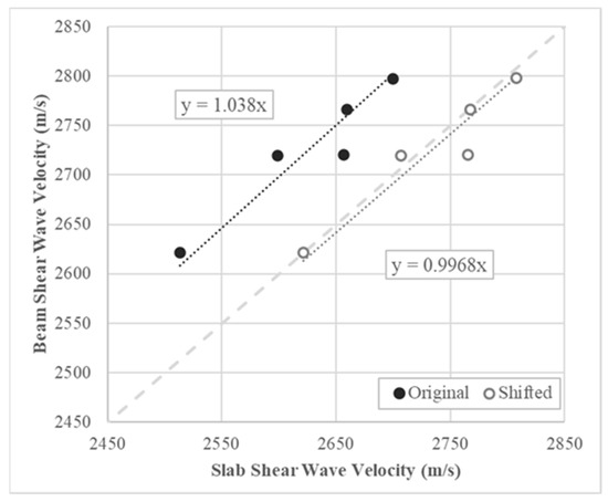 Figure 4 shows how the field shift factor adjusts the field strength gain rate to better correspond to strengths measured in a laboratory. The dashed line represents a 1:1 ratio between beam and slab shear wave velocity and the shifted slab data is clearly closer to representing beam velocities.