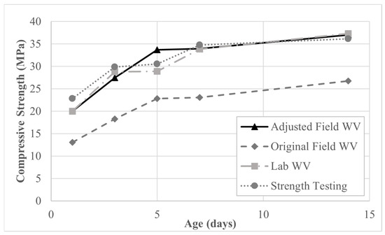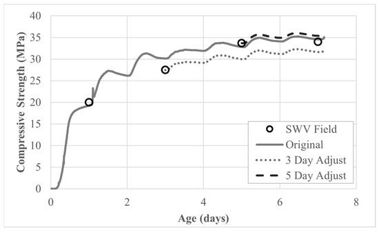 Figure 6 shows how the strength gain rate was adjusted for the test section on days 3 and 5. The original line shows the strength gain rate from the initial pour according to the maturity–strength relationship. It aligns well with the day 1 field strength estimated by the shear wave velocity. However, on day 3, when the field strength was again determined, the prediction was overestimated. The strength gain rate can be adjusted down to predict the strength gain from that point. Again, on day 5, it was found that the prediction underestimated the strength in the field. The strength gain rate can then be adjusted up where it continued to represent the actual field strength well.