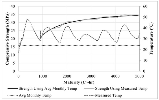 The maturity–strength relationship can be updated to display the concrete strength development after the chosen strength from Step 4 based on the anticipated change in maturity. The future strength gained after the field dataset pavement reaches 20.7 MPa (3000 psi) can now be predicted with proper temperature models: