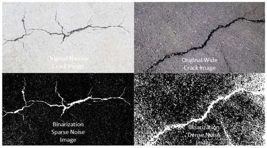 Comparison of the original binarization effect. (a) indicates the effect for wide crack type, (b) indicates which for narrow crack type.