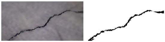 Due to unstable environmental conditions such as light, angle and background tone, the relative size of the main crack feature points and noise points contained in the images collected by the system camera, and the degree of noise dispersion is often uncontrollable, which in turn affects the subsequent image filtering and feature extraction. In 2021, Sheerin er al. [13] conducted an integrated analysis of mainstream crack detection and classification techniques, and proposed the necessary conditions for a pavement crack feature identification algorithm. That is, the morphological characteristics of cracks and noise clusters in different types of scene images should be comprehensively considered, and a targeted filtering model should be established. Accordingly, we experimented with global variance calculation on multiple crack images. Figure 3 shows the comparison of the original binarization effect of the two types images, while Table 1 shows the global variance calculation results of the images. After a large number of experiments, we found that under the condition of fixed size, the image in Figure 3a has relatively narrow cracks and the noise distribution of this type of image after binarized is also relatively scattered, meanwhile, the global variance of the calculated pixel matrix is usually in the range of 0–300 as shown in Table 1. However, the image in Figure 3b has a relatively wide crack and the noise distribution of this type of image after binalization is concentrated on the edge side of the crack. The amount of noise of this type is much larger than that of the narrow crack type image, and the global variance of the calculated pixel matrix is usually greater than 800. Therefore, for a certain size of the crack scene binarized image, the threshold discrimination method is introduced as the image classification policy engine, and 500 is selected as the appropriate classification threshold. According to the difference of the global variance value of the pixel matrix, the image is divided into high-density noise wide crack type and low-density noise narrow crack type, and the corresponding processing strategies are adopted, respectively.