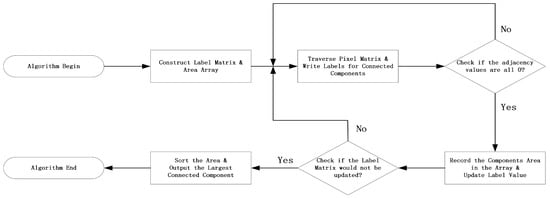 In order to ensure that the feature quantity of the narrow crack would not be affected by the filtering algorithm to the greatest extent, this paper proposes a maximum connected component extraction algorithm based on the pixel features of the eight neighborhoods of the image. Based on the sparse distribution of image noise, the algorithm extracts the largest area connected component to achieve image filtering without feature loss. The algorithm flow is as shown in Figure 8, which could be divided into 5 steps.