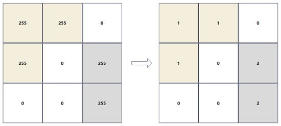- If the values of the four adjacent pixels at the upper left of the traversed pixel are not all 0, assign the same label value to the pixel and the adjacent pixels that are not 0, and record the number of consecutive pixels currently traversed. The working principle of the algorithm is shown in Figure 9.