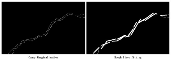 The Hough space transformation uses the global characteristics of the image to connect the edge pixels and form a closed boundary of the region. While directly performing Hough space line fitting on the binarized crack feature image will introduce a lot of unnecessary redundant calculations. In order to achieve the best fitting effect, the algorithm introduces the Canny edge detection algorithm to marginalize the crack feature image in the early stage of Hough line fitting.