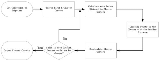 The K-Means clustering algorithm is a clustering algorithm based on the Euclidean distance of feature endpoints. Its core idea is to determine that the closer the distance between two targets, the greater the similarity. By iterative calculating Equation (5), each point in the endpoint set is divided into corresponding clusters by the algorithm [21], where S represents the set of all cluster center points while represents the ith cluster divided by the algorithm, and x represents the coordinates of any feature point located in cluster .