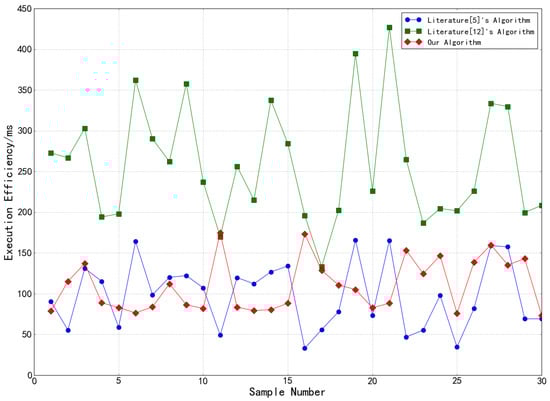 In order to evaluate the performance in execution efficiency between the proposed algorithm and the algorithm in the literature [5,12], this paper takes the above-labeled crack image dataset as the target, and calculates the time cost required by the proposed algorithm and the algorithm in the literature [5,12] to identify crack images with different complexity, respectively, and the results are shown in Figure 20.