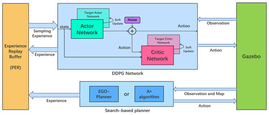 The implementation process of the framework: the search-based algorithm and DDPG are in the same environment for path planning. The search-based algorithm uses global planning and trajectory optimization to provide experience to the DDPG, and the DDPG uses a prioritized experience replay algorithm to extract the experience of both algorithms from the experience pool for training.