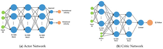 We elaborate the network as shown in Figure 4. We use the multilayer feedforward neural network [40] to complete the mapping from the input to the output. Actor network maps observation data to actions. We design a 5-hidden-layer neural network as a non-linear function approximator to the policy . The first three layers are fully connected networks with 500 rectifier units and ReLU activation functions. Then the full connection outputs the rotational velocity through the Tanh activation function with range , and the normalized value of the translational velocity through the Sigmoid activation function. Critic network maps observation data and actions to Q-values. After the observation data passes through a fully connected layer, it is merged with the current action. After two fully connected layers, the Q value is output through linear activation.