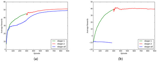 Here, we verify the validity of the proposed multi-stage learning. The agent is first trained in the environment of the first stage. When the training converges, we select the weight of the convergence point as the initial weight for the next stage of training. The effect of the training process is shown in Figure 7.
